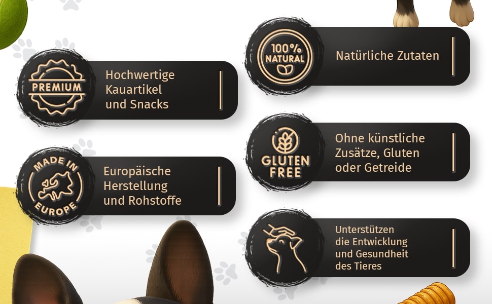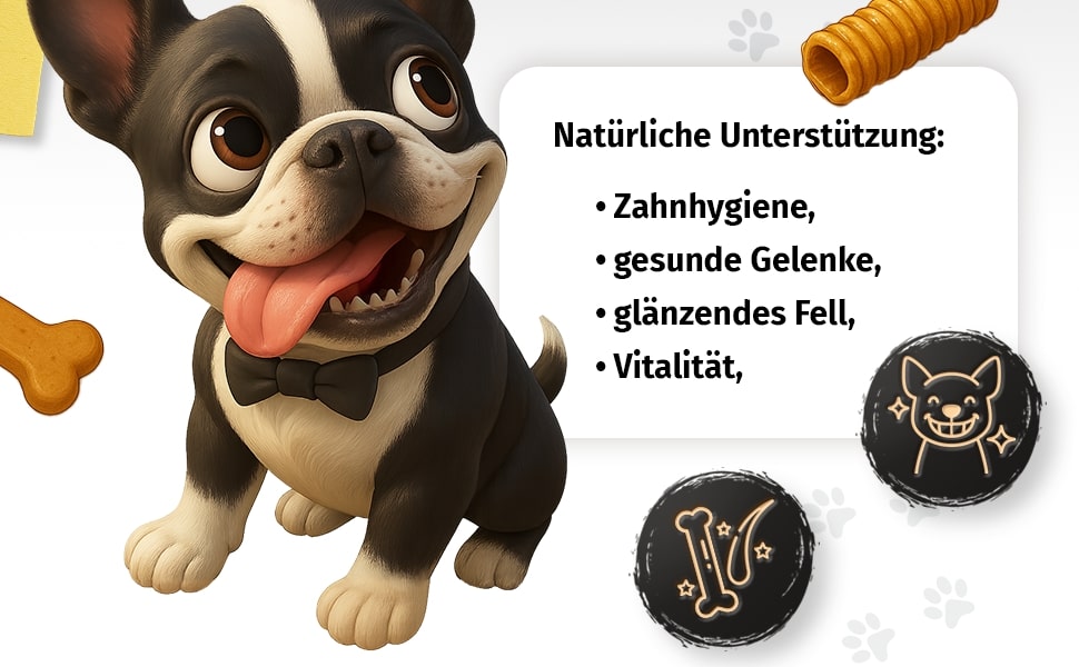 - ZAHNPFLEGE: Die natürliche Konsistenz regt zum intensiven Kauen an, hilft Plaque abzubauen und fördert die Mundflora – ganz ohne Zusatzstoffe. So macht Zahngesundheit auch Ihrem Hund Spaß.